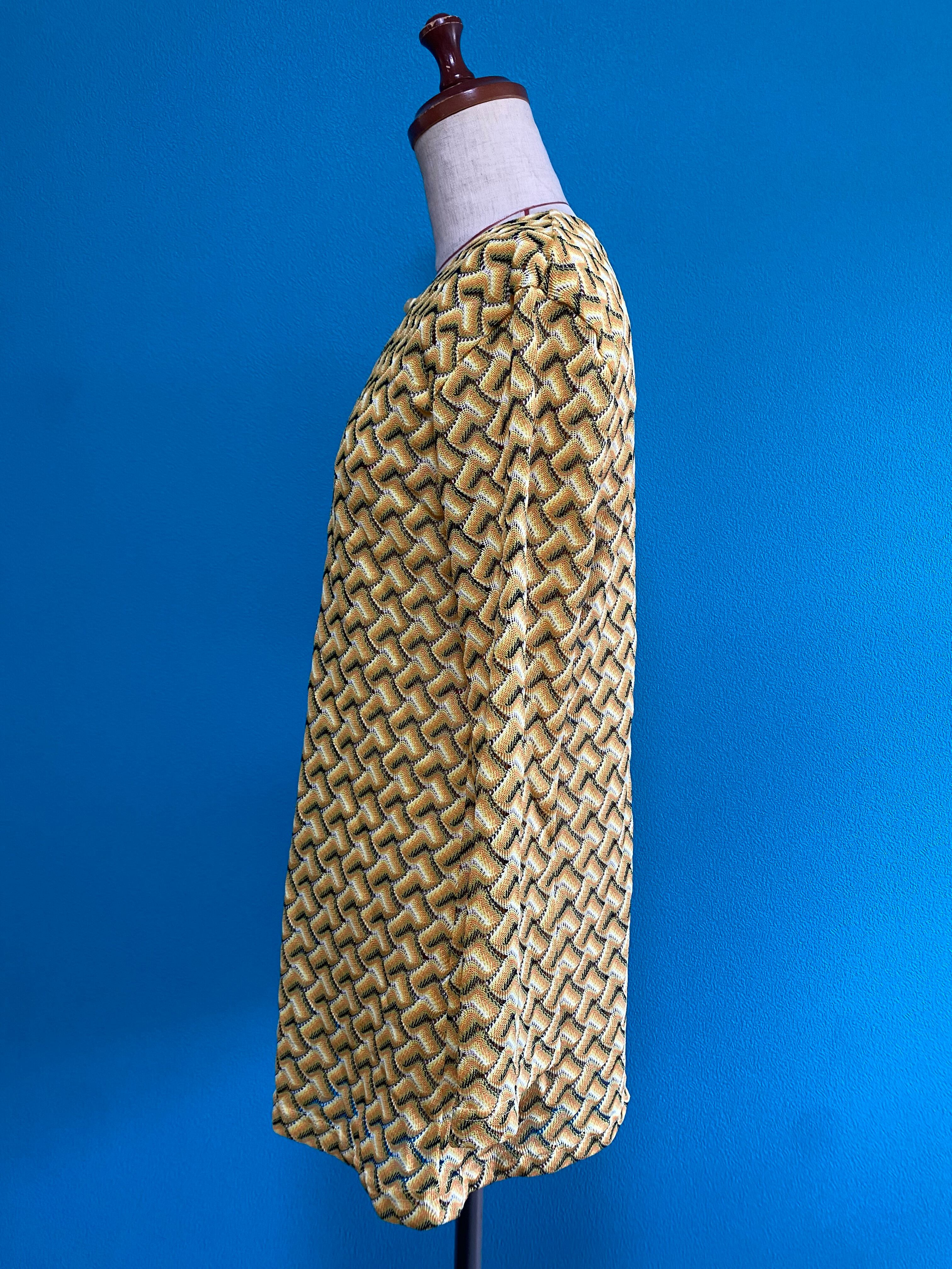 ビタミンカラーでインパクト抜群の柄が全体に編み込まれていてレトロポップで可愛いトップスです。編み目の部分や首元の開いている部分から肌をみせても中に着る服を透けさせても可愛いです。裾が少し広がってるデザインのシルエットも素敵です。長めなのでショートパンツなどと重ねてミニワンピ風に着るのも◎